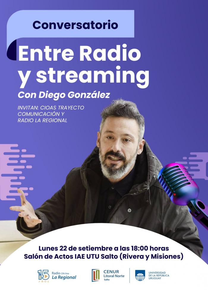 El periodista capitalino Diego González brindará un conversatorio denominado “Entre la Radio y el streaming”, el próximo lunes 22 de setiembre a las 18 horas en el Instituto de Alta Especialización IAE-UTU (Rivera esquina Misiones). La actividad es organizada por Radio online “La Regional” y el trayecto de la carrera de Comunicación de la sede Salto, Cenur Litoral Norte de la Universidad de la República, con apoyo de UTU-IAE.