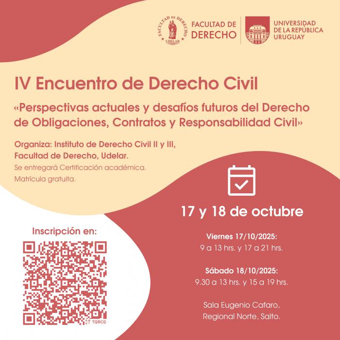 Los días 17 y 18 de octubre de 2025 se llevarán adelante las jornadas en la sede Salto del Cenur Litoral Norte de la Universidad de la República un nuevo encuentro de Derecho Civil "Perspectivas actuales y desafíos futuros del Derecho de Obligaciones, Contratos y Responsabilidad Civil"