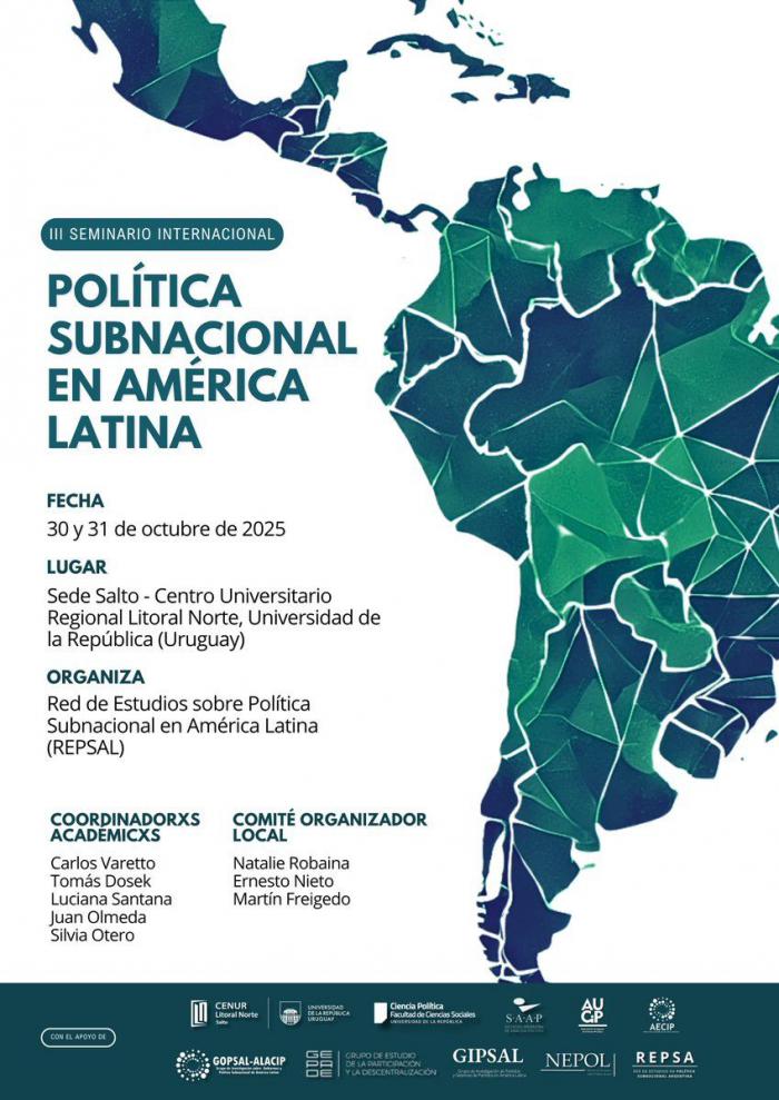 "Durante los días 30 y 31 de octubre se realizará en la ciudad de Salto, Uruguay, el III Seminário Internacional “Política Subnacional na América Latina”. El Seminario se realizará en la sede Salto del Cenur LN de la Universidad de la República. Esta es la tercera edición del evento y cuenta con 6 mesas temáticas, 4 mesas de estudiantes de posgrado y una conferencia magistral. Además, el evento tendrá una apertura oficial y una reunión informal de la Red de Estudos sobre Política Subnacional en América Latina (REPSAL).