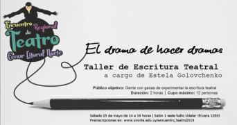 Con la presencia de siete elencos teatrales de Uruguay y Argentina, los próximos 23, 24 y 25 de mayo, la sede Salto del Cenur Litoral Norte de la Universidad de la República, organiza el Encuentro Regional de Teatro en el Cenur Litoral Norte. En ese marco, el sábado 25, Estela Golovchenco dictará un Taller de Dramaturgia.