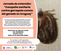 En el marco del taller de epidemiología, la Facultad de Veterinaria sede Salto del Cenur Litoral Norte, Universidad de la República y el Ministerio de ganadería Agricultura y Pesca (MGAP) informan e invitan a la jornada de extensión, sobre “Campaña sanitaria contra garrapata común del ganado (Rhipicephalus microplus) en Uruguay”.