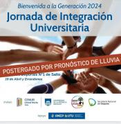 Ante los pronósticos de lluvia y tormenta para este miércoles 20 de marzo, la actividad prevista realizarse en Plaza de Deportes N°1 de Salto, “Jornada de Integración Universitaria” y Bienvenida a la Generación 2024 de estudiantes de la sede Salto del Cenur Litoral Norte de la Universidad de la República, se pospone para el mes de abril.
