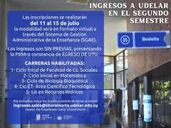 El Departamento de Enseñanza del Cenur Litoral Norte sede Salto informa del segundo período de ingreso a la Universidad de la República en el segundo semestre.